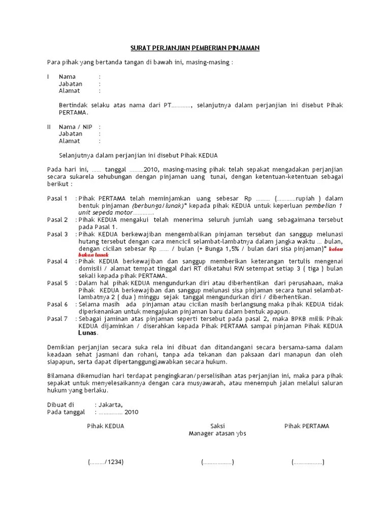 Penggunaan surat perjanjian hutang bisa meningkatkan kepercayaan kedua belah pihak ; Namun ada kalanya juga pemberi pinjaman meminta membuat surat perjanjian dengan materai. Hal tersebut dikarenakan telah ada bukti dan peraturan jelas secara tertulis dan … Ada juga yang menggunakan surat pernyataan kesanggupan … Surat pernyataan termasuk surat resmi yang harus ditulis berdasarkan format tertentu.